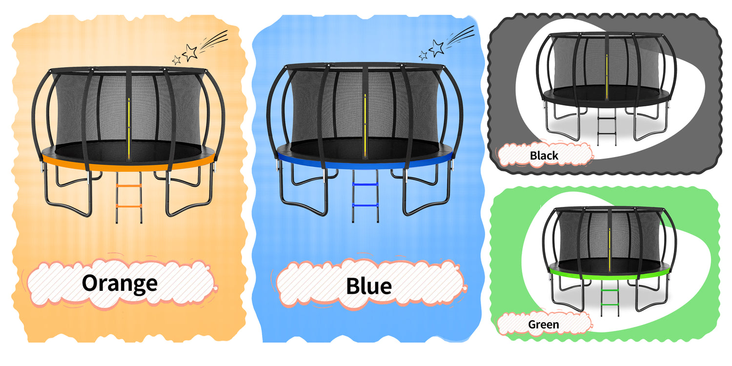 - Trampoline with colorful spring covers: Orange, Blue, Black, Green.